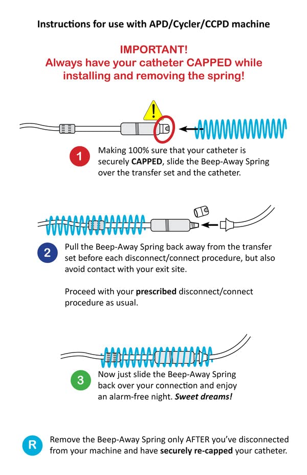 Details: Beep-Away Spring helps reduce the potential for tubing kinks during nighttime cycler PD. This is a simple, soft, flexible plastic coil for use at night * For Health and Safety only unopened, unused product may be returned for refund within 30 days. **NOTE: NOT SUITABLE FOR FRESENIUS STAY SAFE CONNECTORS